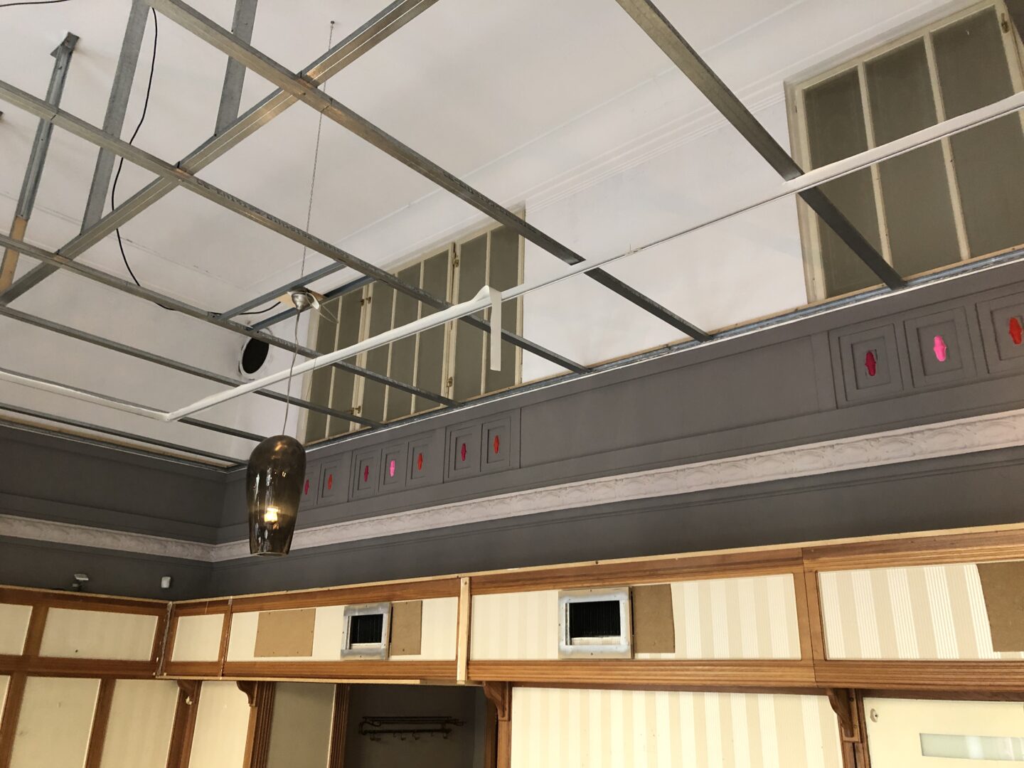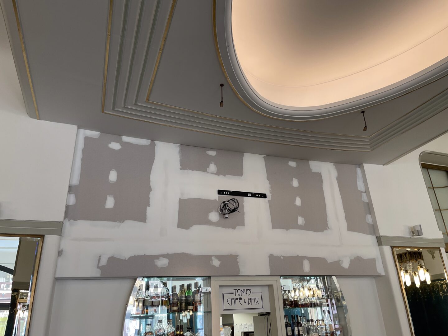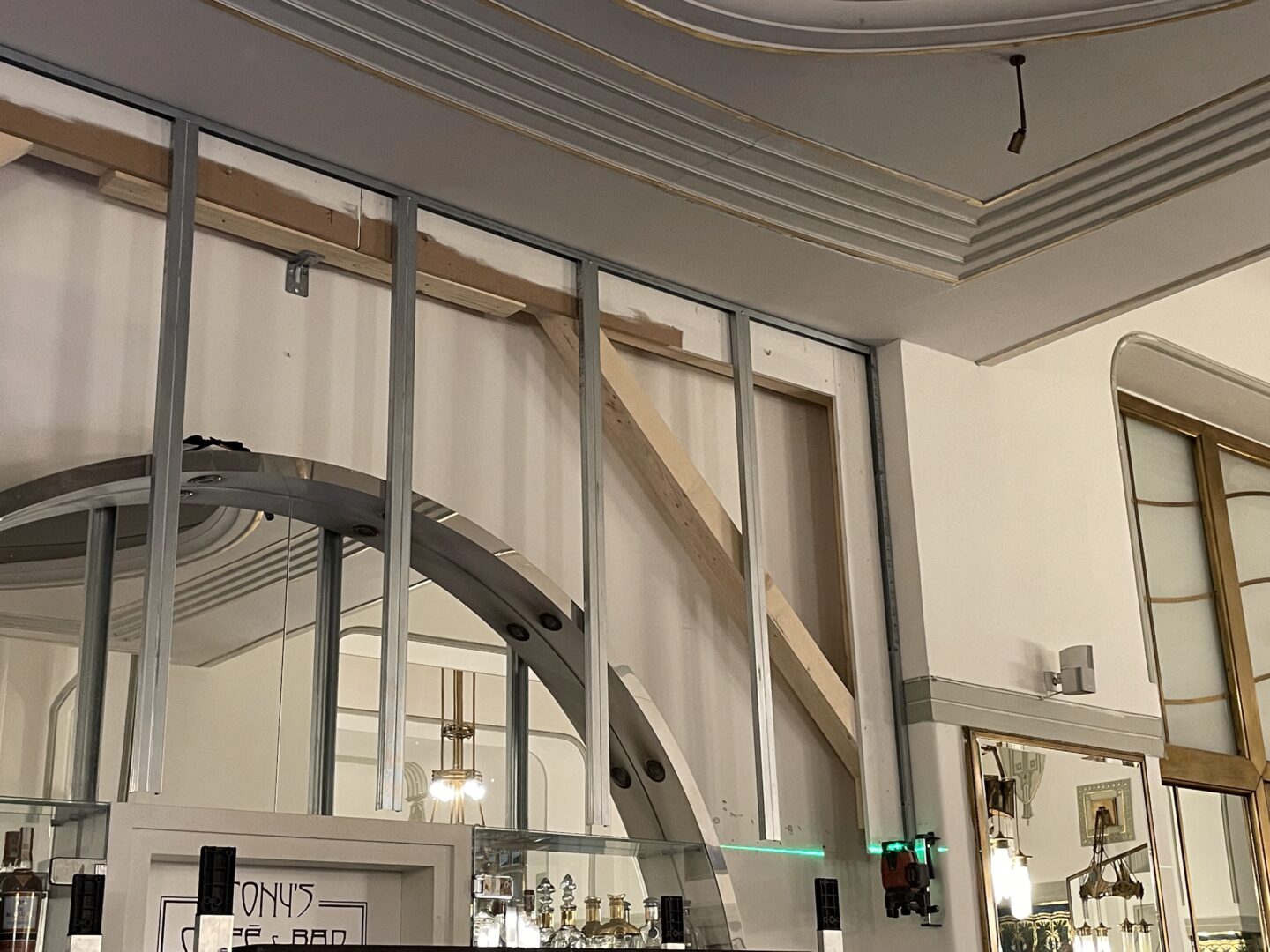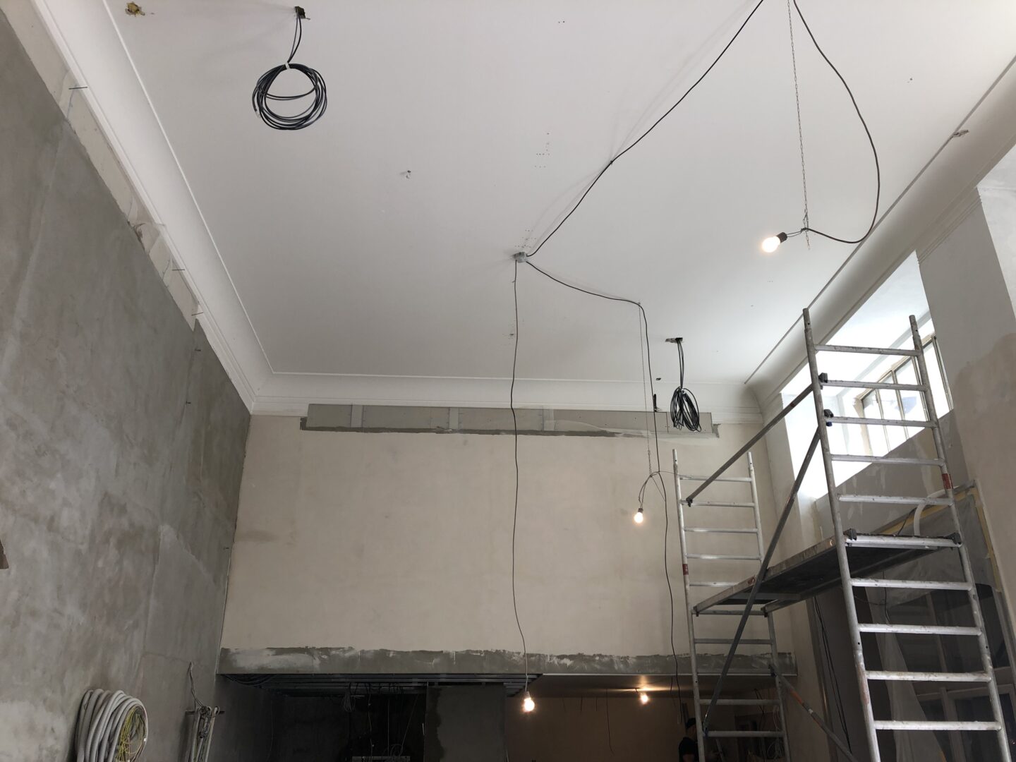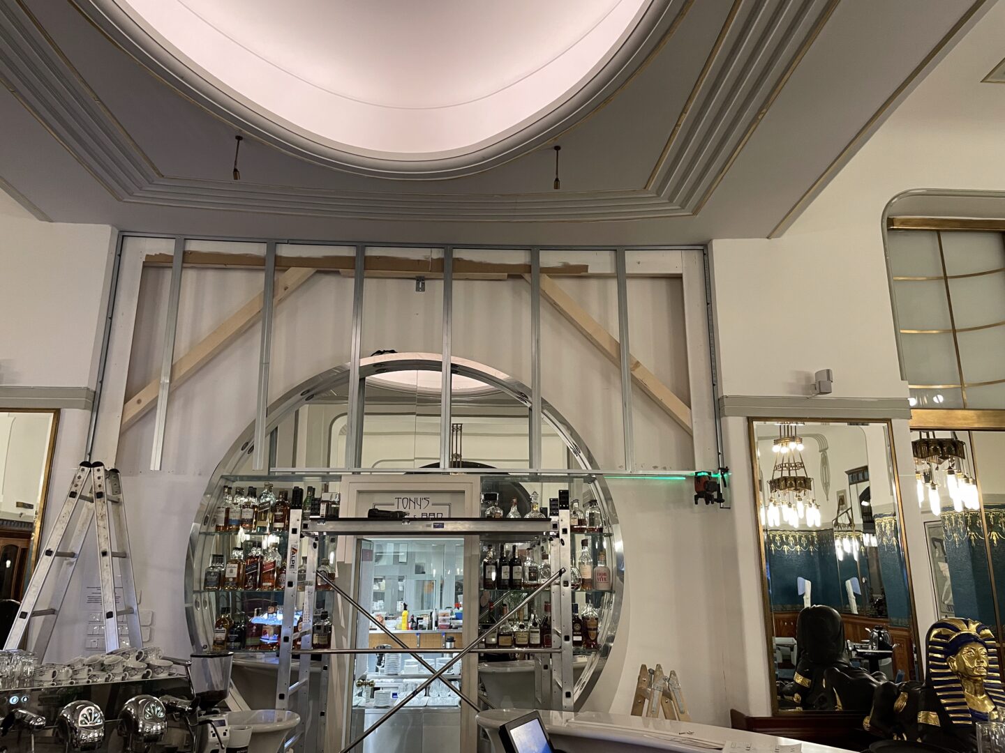 Instalace nosných konstrukcí a sádrokartonového zapláštění včetně stavebních úprav a malířských prací v historickém interiéru hotelu Paříž.