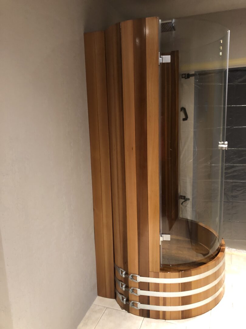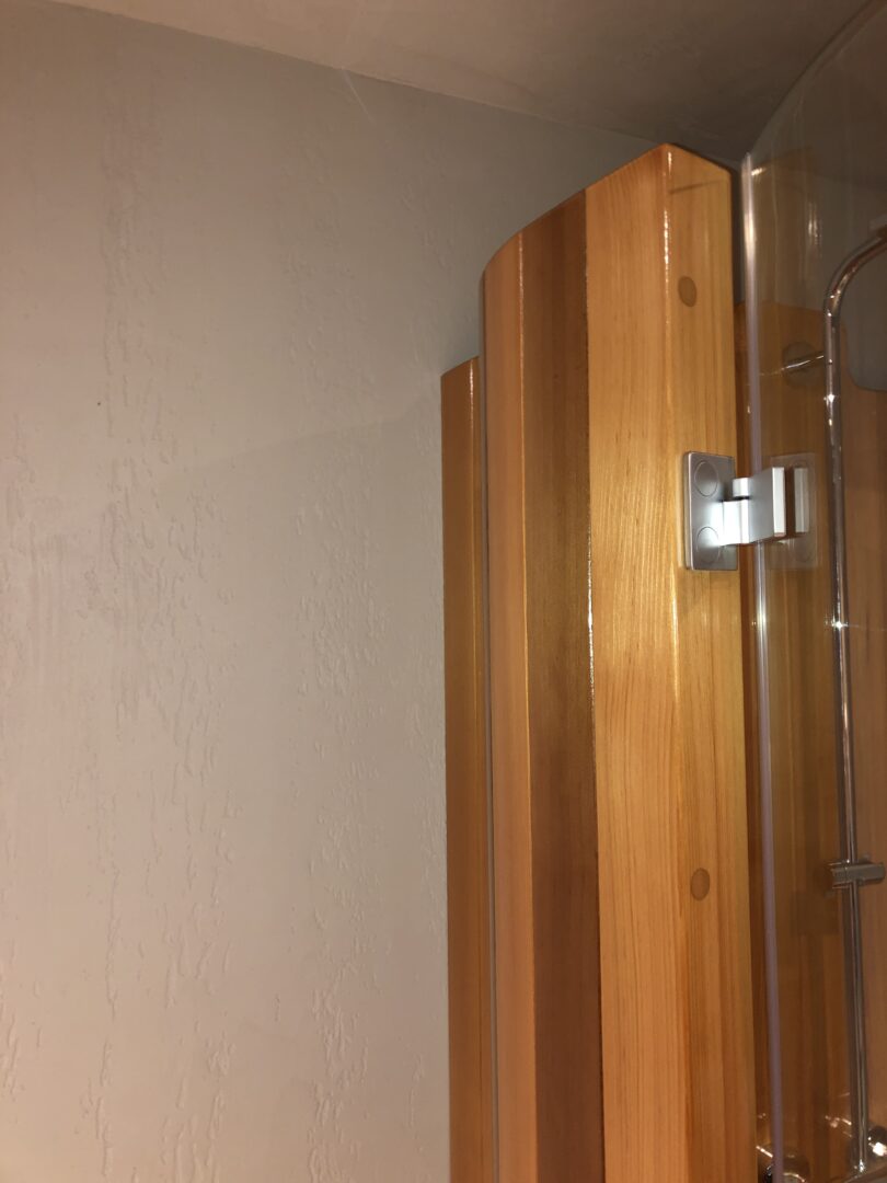 Rozsah: Úprava interiéru vstupní haly a montáž sprchové kabiny z masivního dřeva