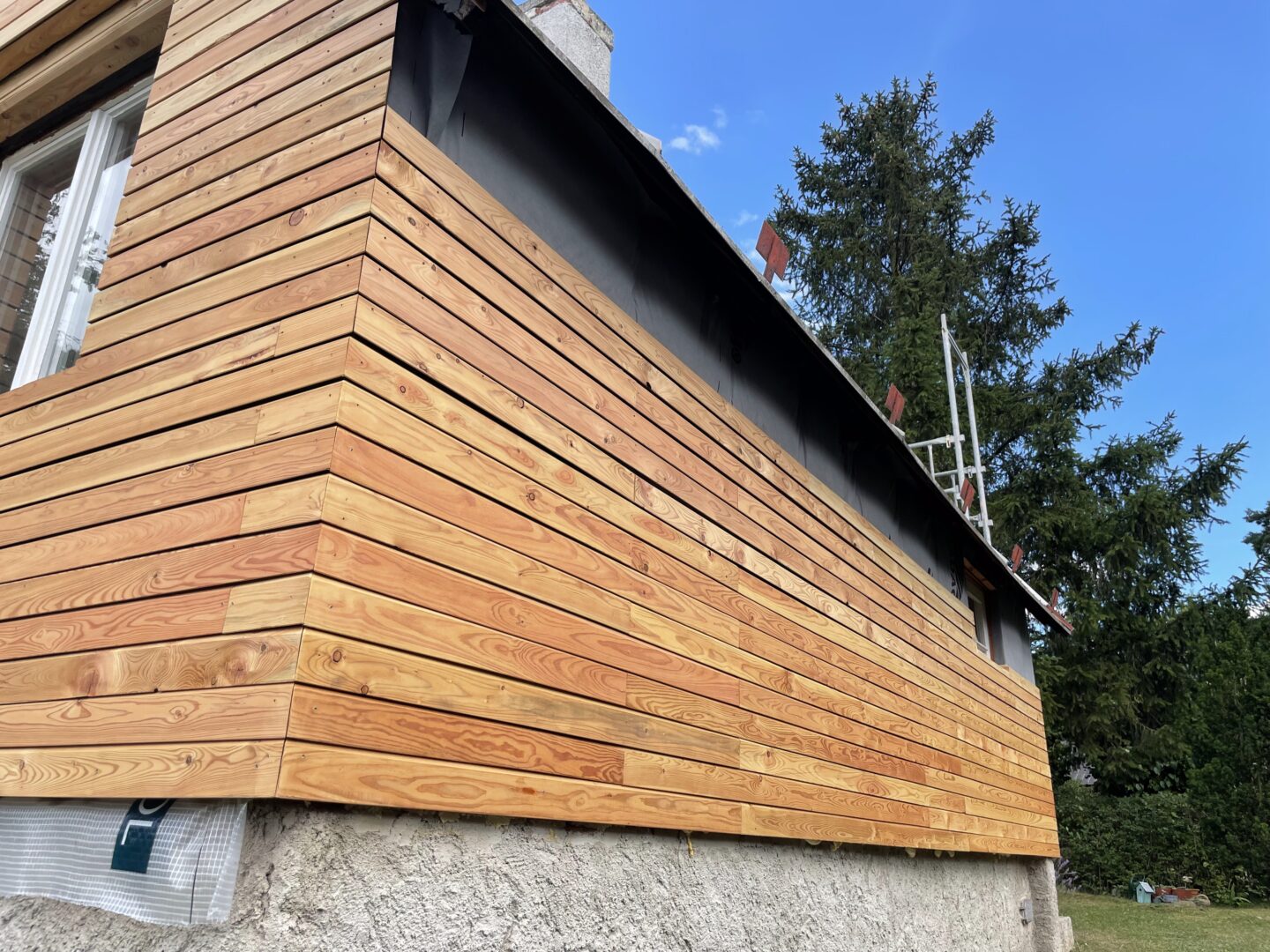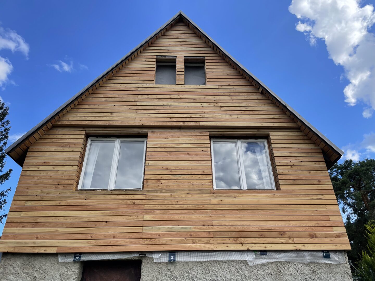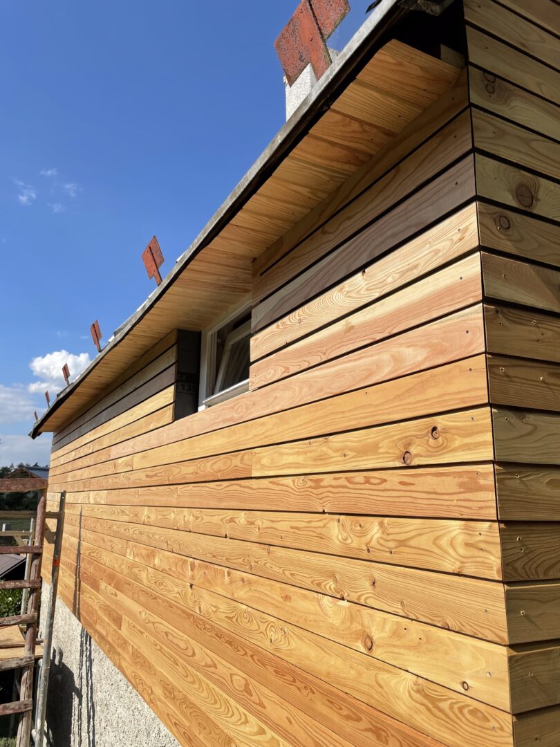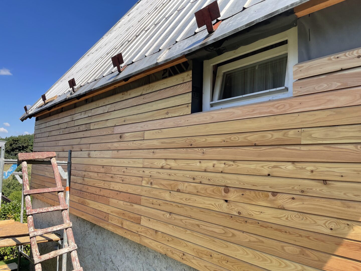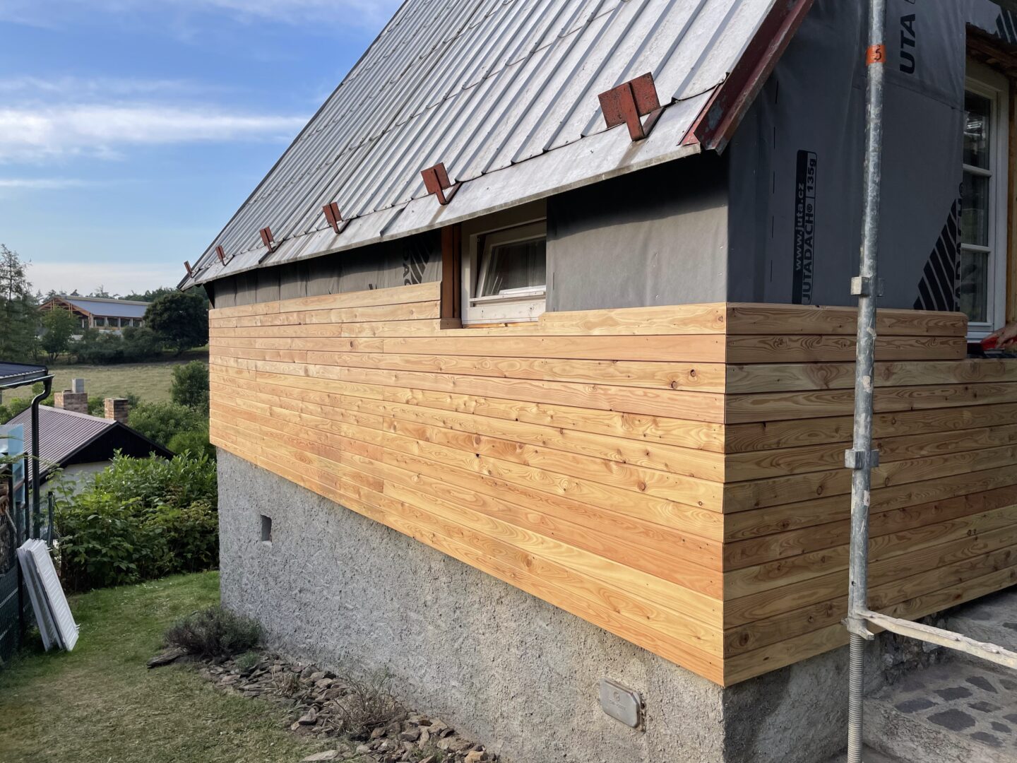 Kompletní zateplení a nová fasáda z modřínových palubek Rhombus. Projekt sjednotil vzhled a zlepšil energetickou účinnost rekreační chaty.