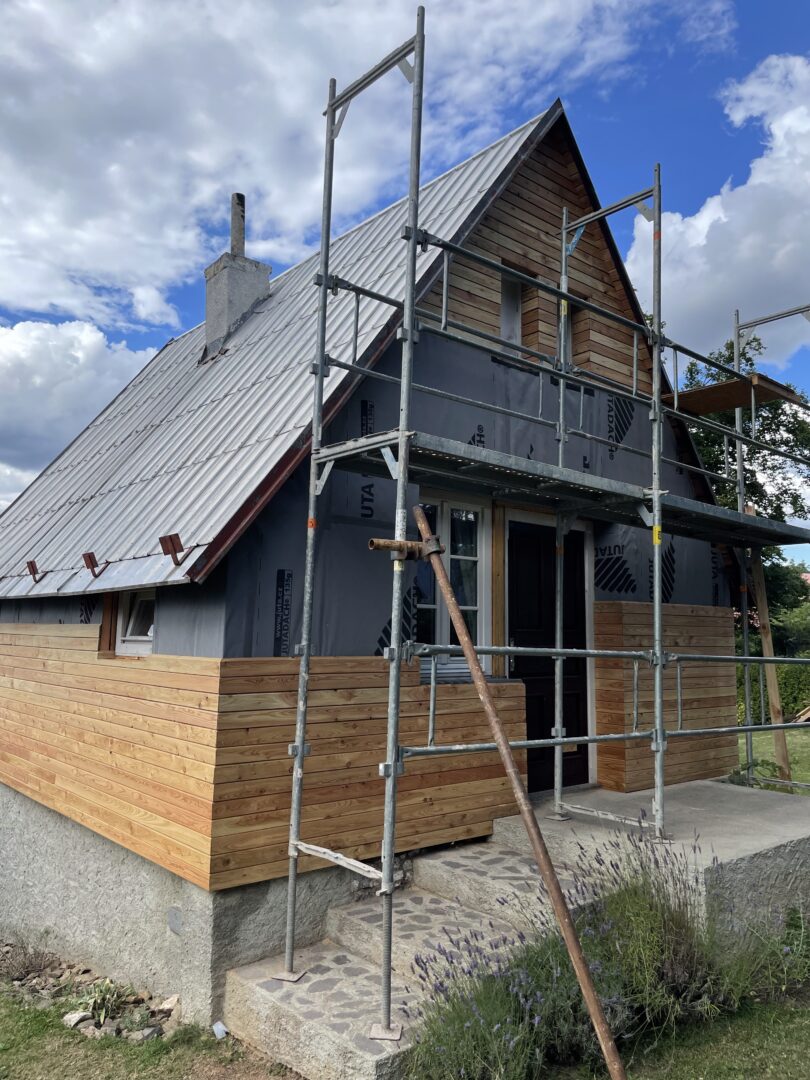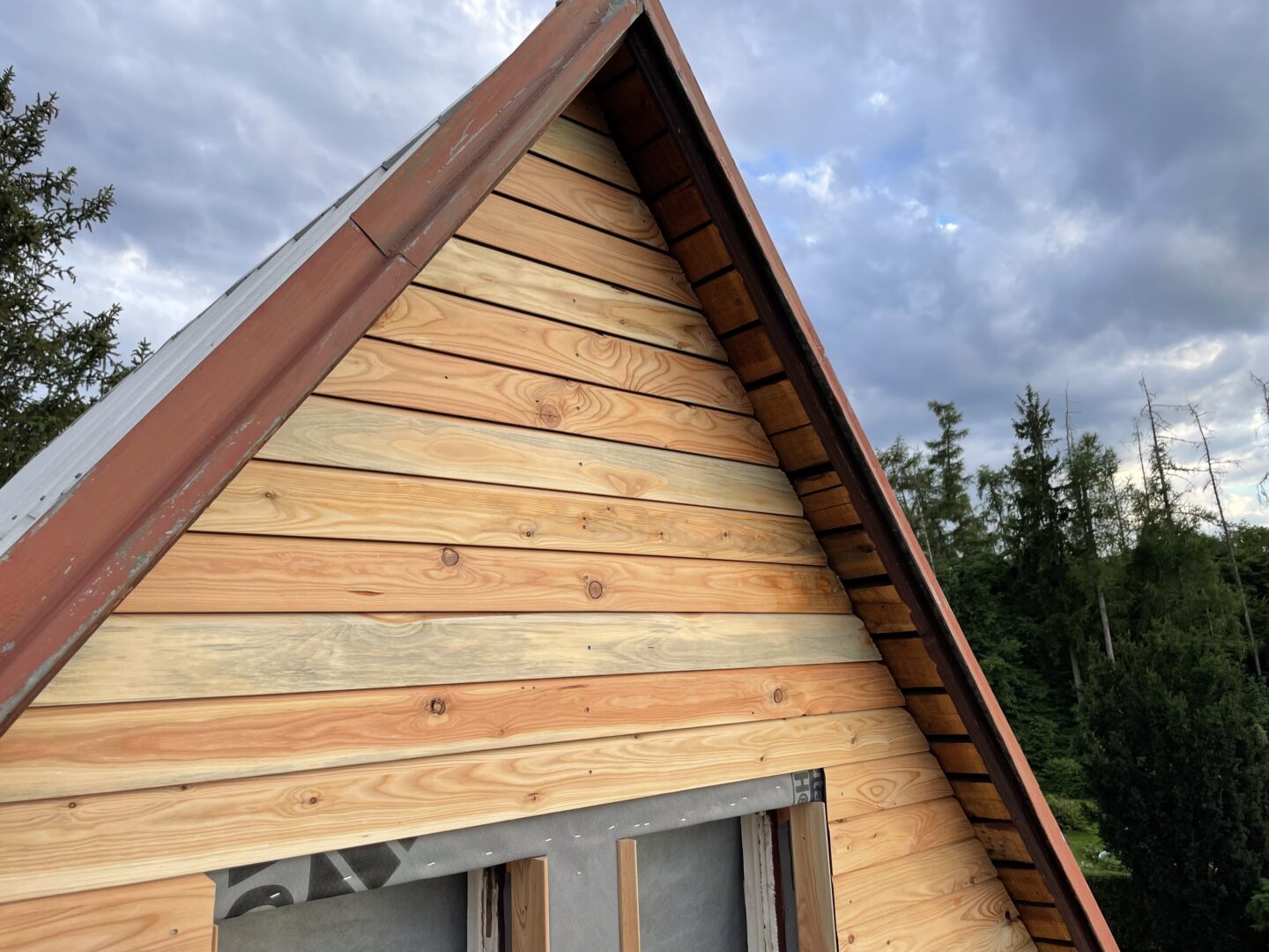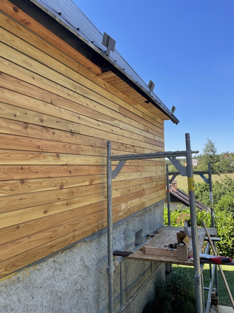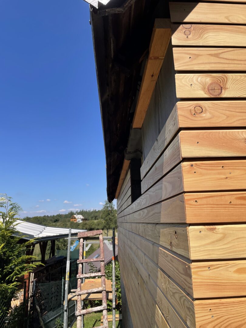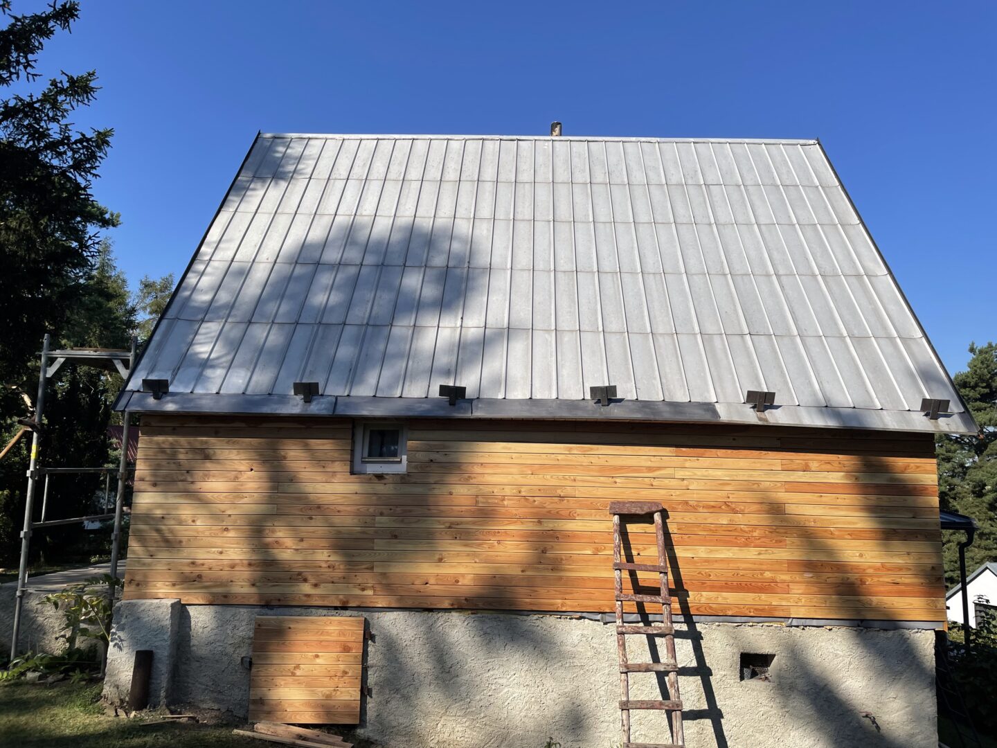 Kompletní zateplení a nová fasáda z modřínových palubek Rhombus. Projekt sjednotil vzhled a zlepšil energetickou účinnost rekreační chaty.